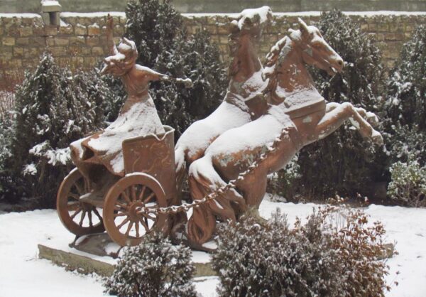 The association between water and wisdom that is common to many ancient cultures is also evident in the Aban Yasht, for here Aredvi Sura is the divinity to whom priests and pupils should pray for insight and knowledge (5.86). In verse 5.120 she is seen to ride a chariot drawn by four horses named ‘wind’, ‘rain’, ‘clouds’ and ‘sleet’. In newer passages she is described as standing in ‘statuesque stillness’, ‘ever observed’, royally attired with a golden embroidered robe, wearing a golden crown, necklace and earrings, golden breast-ornament, and gold-laced ankle-boots (5.123, 5.126-8). Aredvi Sura Anahita is bountiful to those who please her, stern to those who do not, and she resides in ‘stately places’ (5.101).