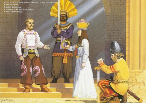 [Click to Enlarge] Recreation of the facade of a Sassanian palace and Bahram Chobin receiving a diadem (possibly representing the Farr or “Divine Glory”) from a priestess of the Anahita temple (Source: Kaveh Farrokh, Elite Sassanian Cavalry, 2005 –اسواران ساسانی–).
