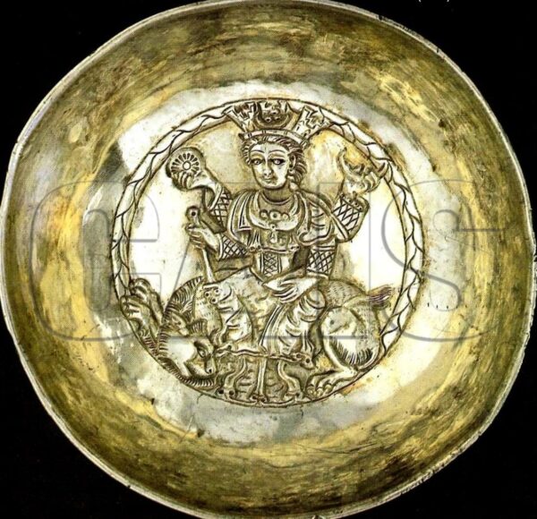 [Click to Enlarge] A 4th century Sassanian silver bowl featuring a high-relief decoration of the Goddess Anahita. She sits atop a lion and in her right hand is the sun (Photo Source: CAIS).